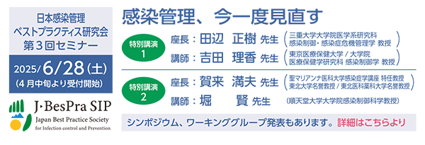 | 第3回 | 2025年3月1日(土)13時~17時 | 特別講演 「感染管理ベストプラクティスを医療機関・福祉施設で推進するための戦略」 |